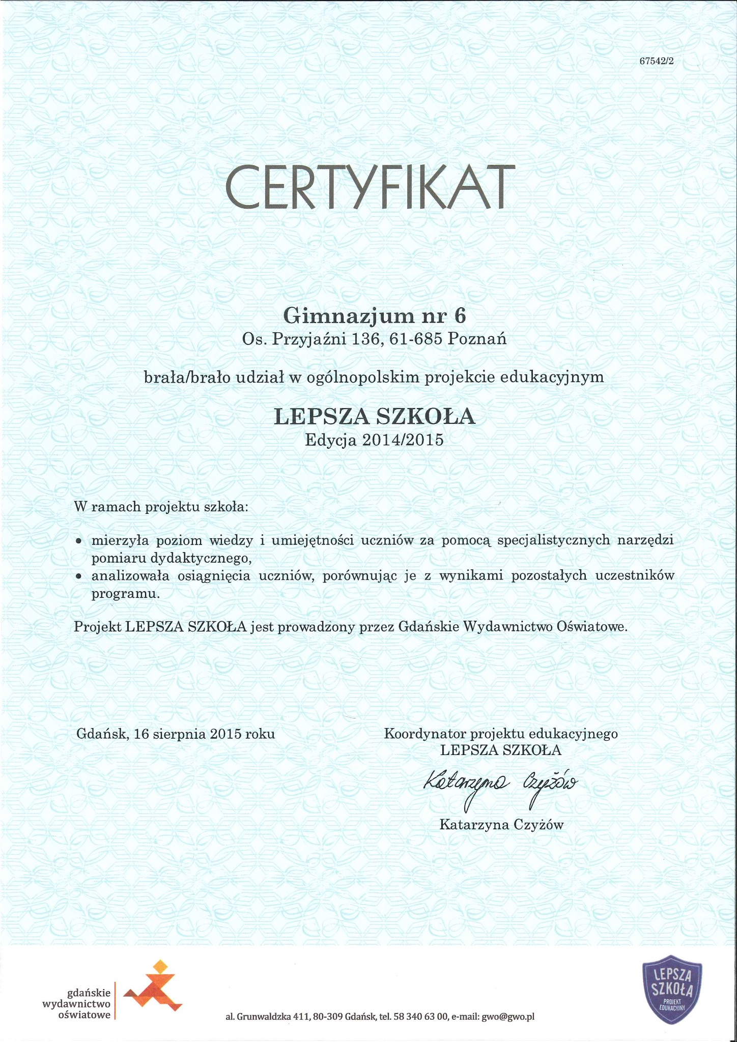 Otrzymaliśmy certyfikat potwierdzający udział Gimnazjum nr 6 w projekcie "LEPSZA SZKOŁA" edycja 2014/2015. [zobacz]